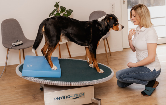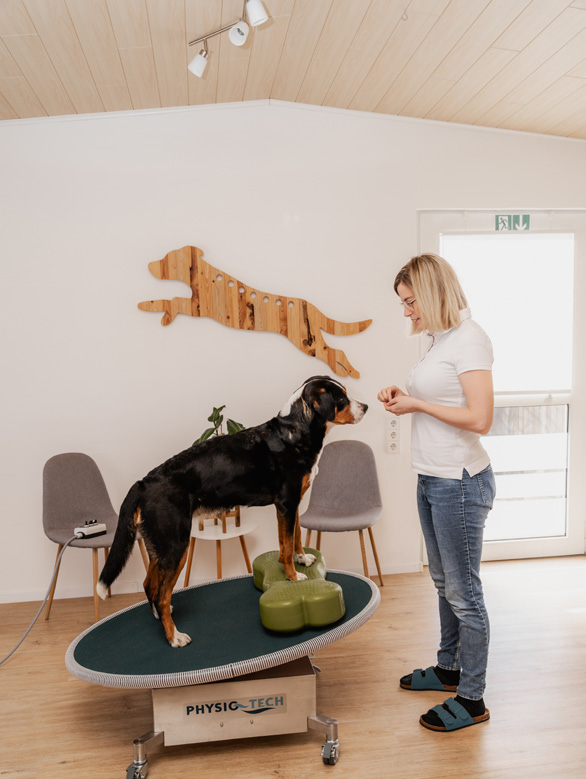 Der Vorteil gegenüber klassischen Wackelbrettern: Ihr Hund muss nicht aktiv das Gleichgewicht halten, sondern wird durch die motorisierten Schwingungen passiv stimuliert. Das ist deutlich stressärmer – besonders für ängstliche oder schmerzempfindliche Patienten. Nach Anleitung können Sie die Behandlung gerne alleine durchführen und so die Bindung zu Ihrem Tier stärken und ihm ein gewohntes Umfeld bieten.